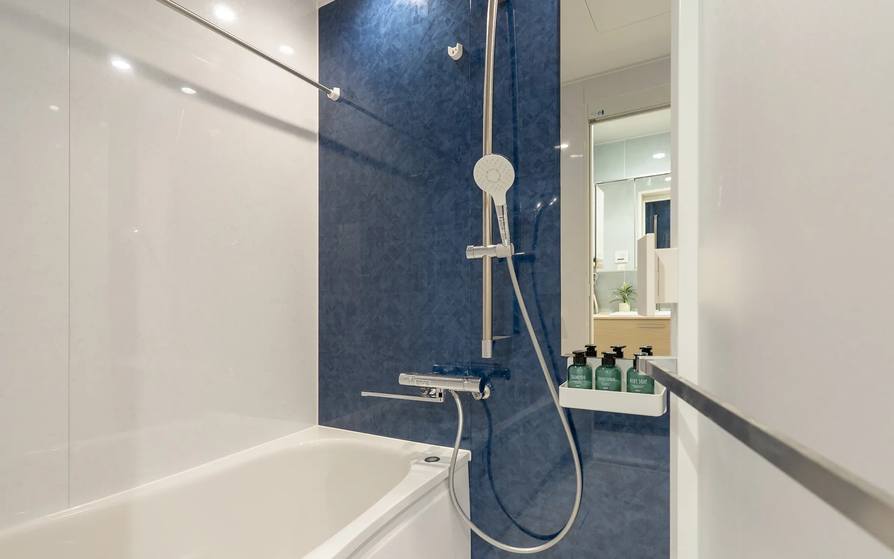 シャンプー、トイレ用ブラシ、シャワー、浴室乾燥機、トイレットペーパー、脱衣所、バスマット、浴槽