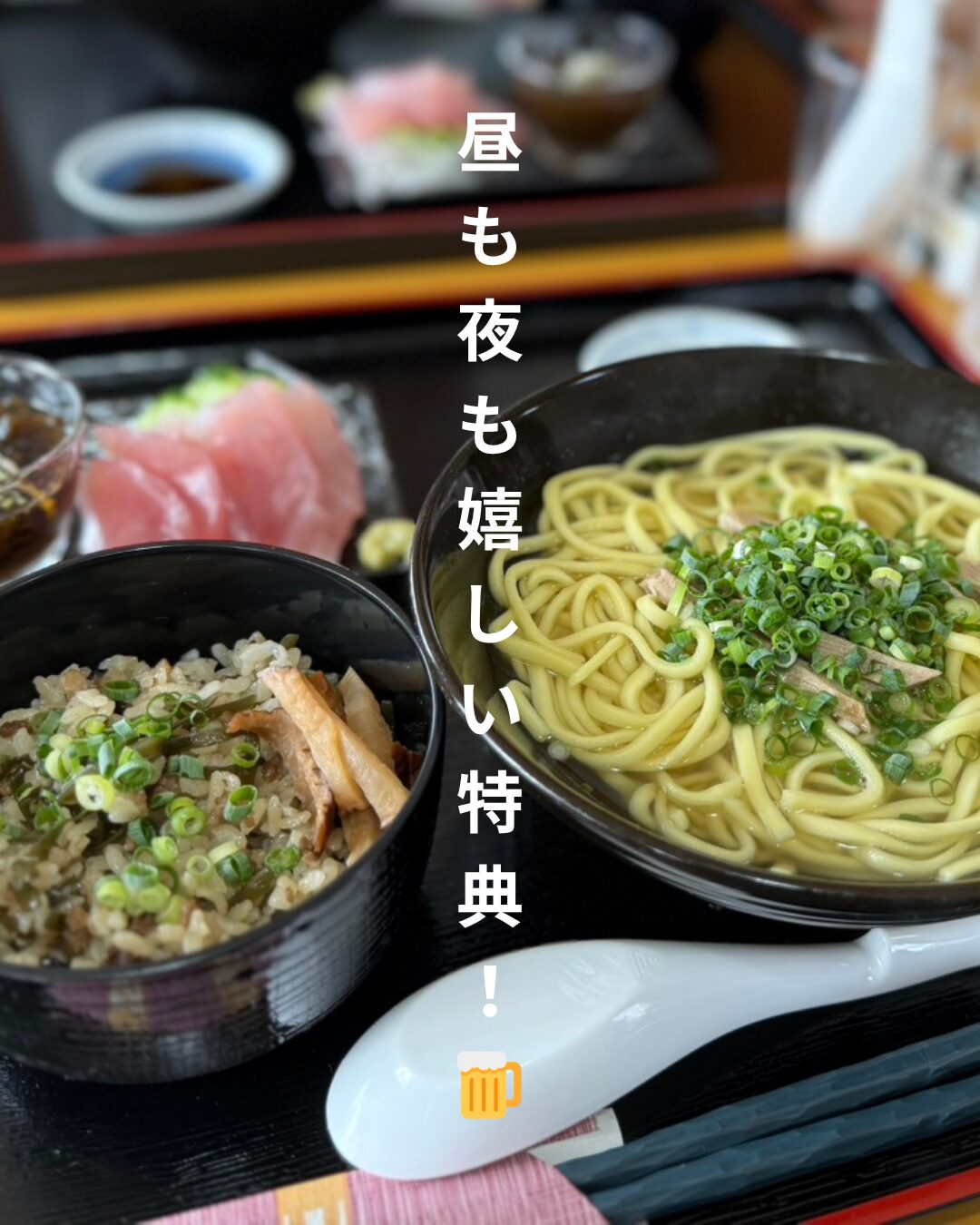 ほかにも、香ばしいじゅーしー(炊き込みごはん)とそばのセットや、そば・じゅーしー・お刺身が楽しめる 八重山そば定食 など、島の味をしっかり堪能できるメニューが並びます。